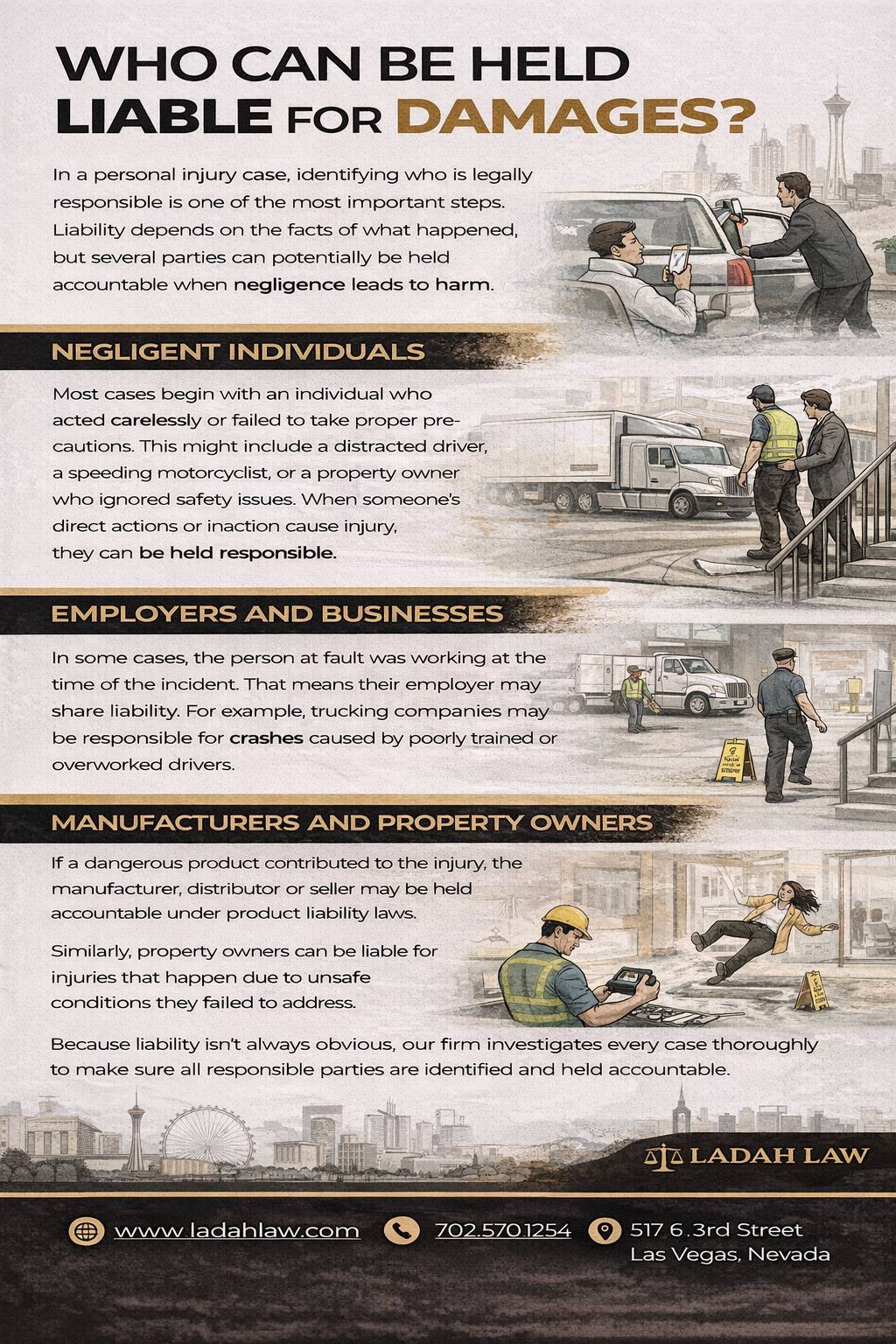 In Las Vegas, car accidents can be complex and involve numerous issues such as fault, coverage of insurance costs, and financial compensation. An attorney experienced in these matters is the best to handle your claim – investigating the accident situation thoroughly to establish liability on behalf of an at-fault driver due to distracted driving or any other traffic rule violations. This lawyer will help you obtain a fair settlement for damages stemming from injuries connected with that incident.
